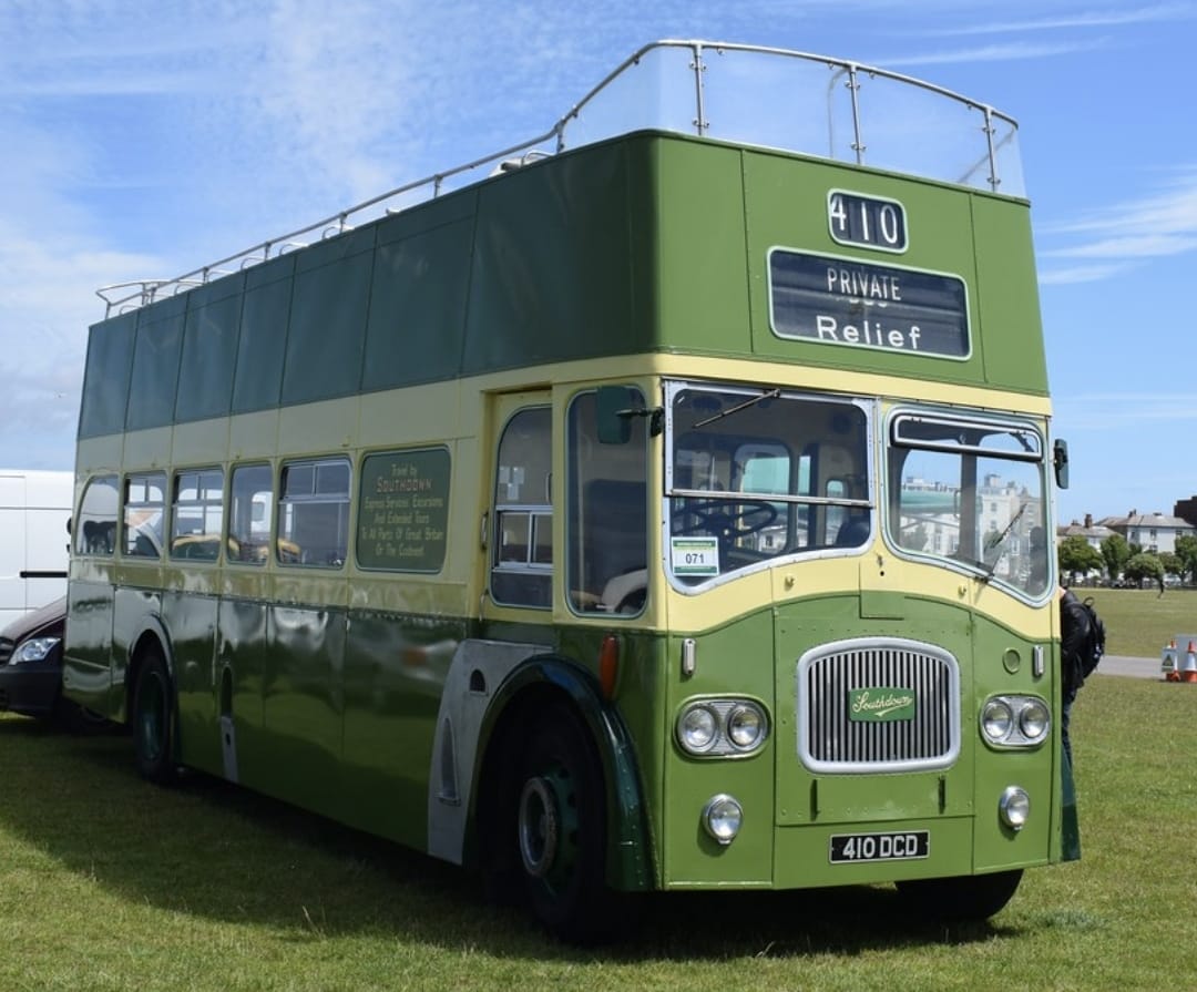 In 1957 regulations permitted double deckers to be the maximum permitted size of 30ft long and 8ft wide. Over a period of 10 years Southdown took delivery of 285 QM’s . Car 410 is one of several convertible open tops. She corries 69 passengers and is a regular feature on the no 11 Heritage bus service. The bus is available throughout the year weather dependant.