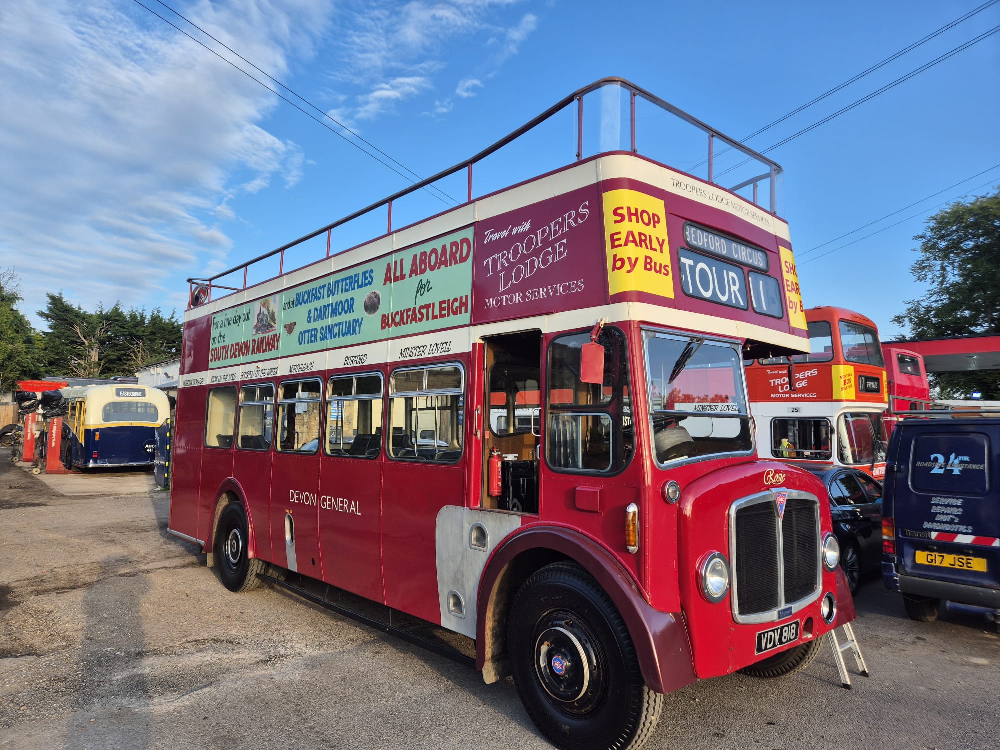 TFJ808 or ‘Kenneth’ is a 1956 Guy Arab Mk4 with Massey body work. New to Exeter Corporation in 1956, this bus spent its entire life working in and around Devon. With its distinctive half cab and exposed radiator, this is one of the most used buses in our collection. Kenneth is one of the older half cabs we use, he has a very tuneful gear box and can carry 56 passengers. Booking is recommended to be as early as possible as Kenneth can be busy all year round. This bus is inspected for safety every 10 weeks for safety, full class 6 mot, tachograph fitted and calibrated.